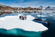 Anschließend geht es weiter in den Johan-Pedersen-Fjord. Hier treiben bizarre Eisbrocken im Wasser, während steile Auslassgletscher in den Fjord kalben. Besonders eindrucksvoll: der monumentale Hann-Gletscher. Die massive, steile Gletscherfront und das Spiel des Lichts auf den Eisblöcken erzeugen eindrucksvolle Fotomotive in verschiedenen Blautönen. Umgeben von zerklüfteten Bergen entsteht ein dramatisches Panorama. Bei einer kurzen Wanderung an Land eröffnen sich zusätzliche Perspektiven auf die Landschaft, die die Größe und Kraft der Gletscher sowie die kleinen menschlichen Spuren im Fjord besonders deutlich machen – ein starker Kontrast zwischen Mensch und Natur.