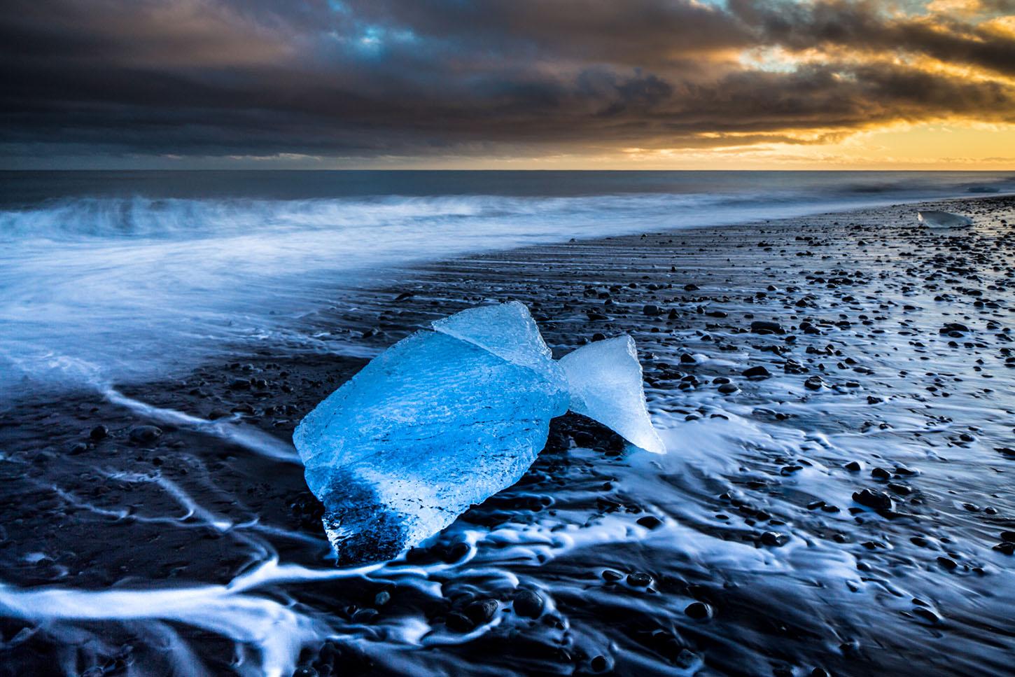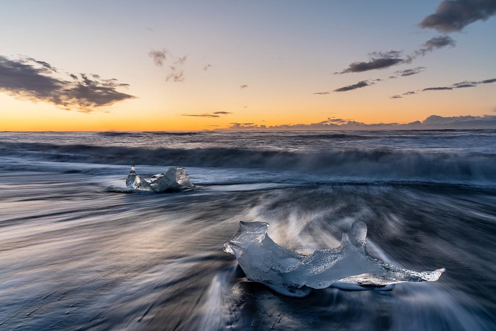 Vor Ihnen und Ihrer Linse erstreckt sich der glasklare Gletschersee, auf dem kleine Eisberge majestätisch in vielen Blautönen schimmern. Wie von Zauberhand treiben diese Formationen sanft dahin und verschwinden schließlich in den wilden Wellen des Atlantiks. Doch das ist nicht alles, was die Natur dieser Region Ihnen, den anderen Teilnehmern unserer Fotoreise Island und anderen Fotografen zu bieten hat. Eisbrocken und sogar kleine Eisberge aus der Gletscherlagune Jökulsárlón, die zuvor in den wilden Atlantik getrieben wurden, werden bei Ebbe wieder an die umliegenden Strände gespült. Der schwarze Basaltstrand, der sich vor einem ausbreitet, bildet dabei einen beeindruckenden Kontrast zum glänzenden Eis. Dieses Szenario ist einfach fantastisch und regt jeden Fotografen zu kreativen Höchstleistungen an. Die surreale Verschmelzung von dunklem Vulkangestein und schimmerndem Eis ist ein absolut einzigartiges Erlebnis, das Ihre Bilder zu wahren Kunstwerken werden lässt!