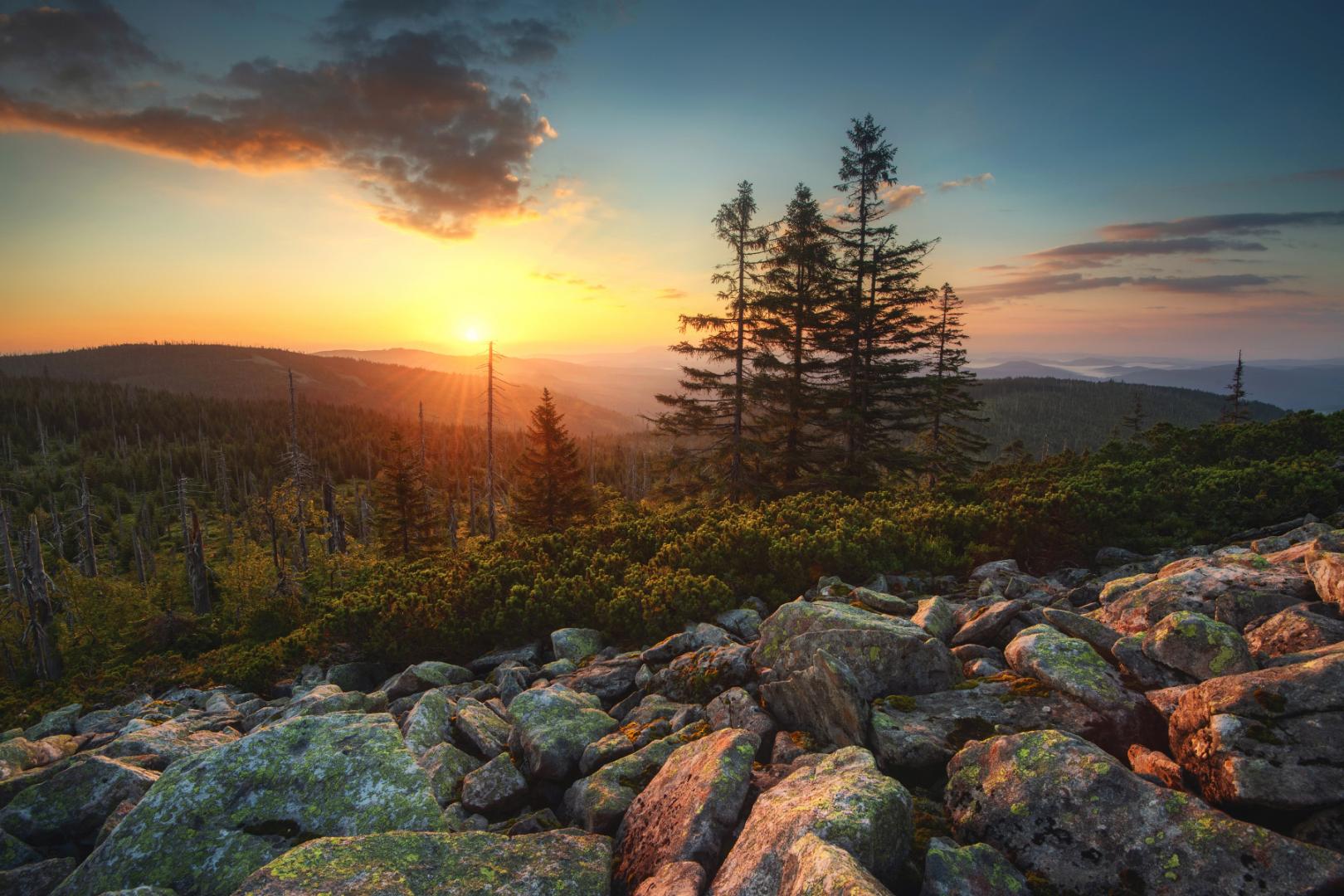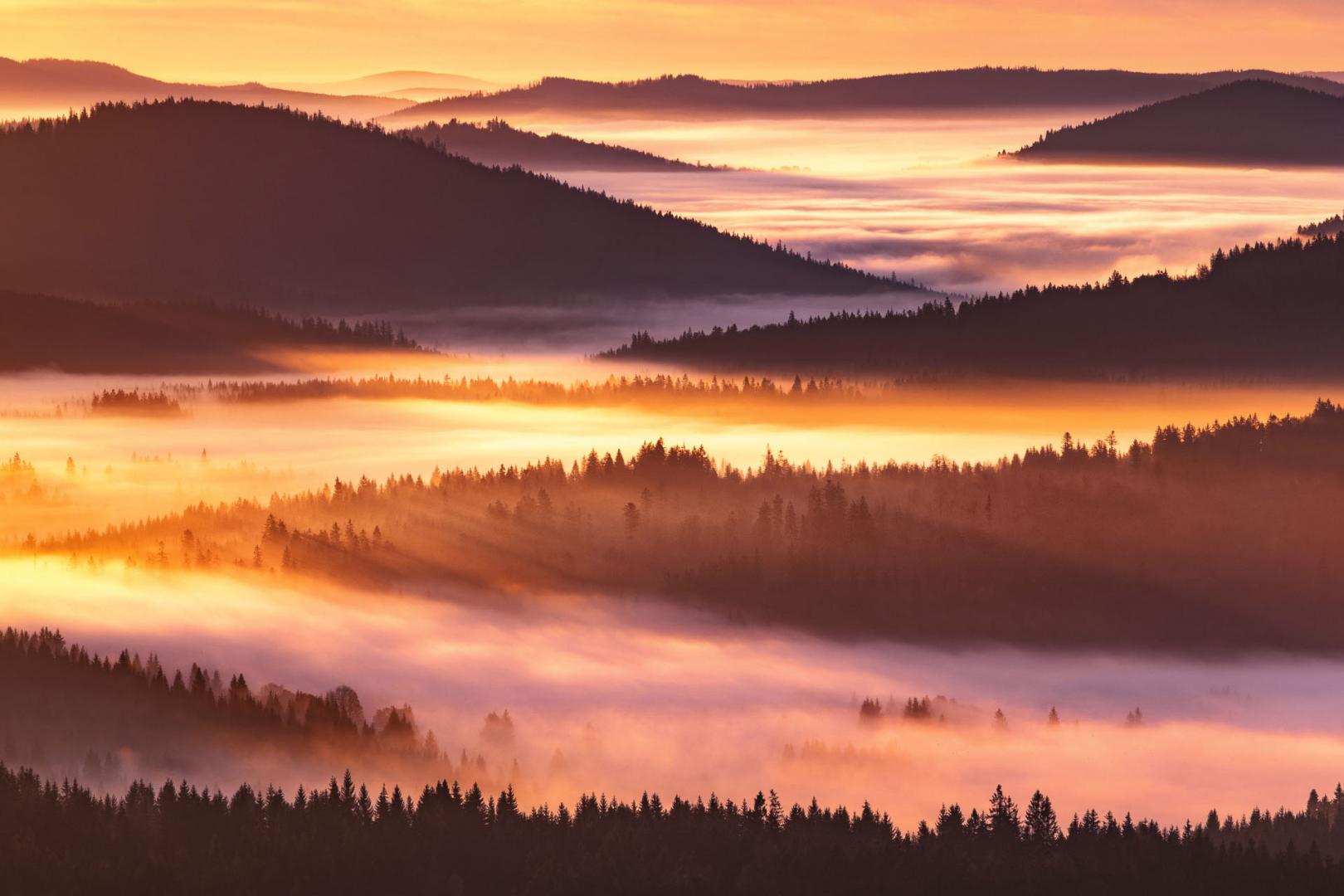 Ein letzter Sonnenuntergang im Bayerischen Wald. Warm eingepackt, die Stirnlampen griffbereit, das Stativ geschultert. Wenn das Licht gedämpfter, die Luft klarer und kühler wird, deutet alles auf stimmungsvolle Abendfotos zur Blauen Stunde hin. Und wenn dann noch Nebelschwaden langsam durch die Täler ziehen, wird es ein grandioses Finale des Fotoworkshops im Bayerischen Wald.