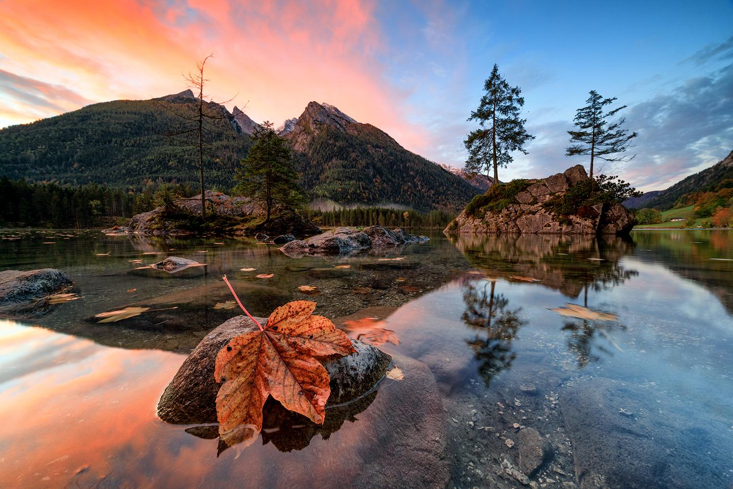 Den wildromantischen Hintersee, umrahmt von Berggipfeln und dem sagenumwobenen Zauberwald, fotografieren Sie zum Sonnenaufgang, wenn leichter Bodennebel über dem smaragdgrünen Bergsee wabert. Die Felsen, mit dickem Moos bewachsen, und bizarre Baumstumpfen bilden einen natürlichen Rahmen und fokussieren das Panorama.