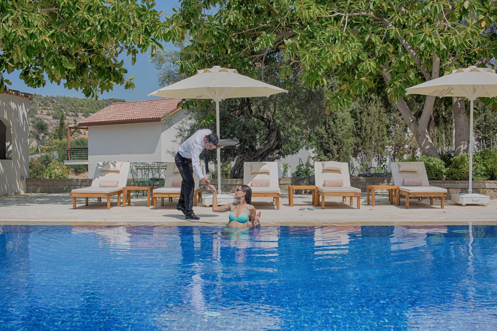 Eine wunderbare Berglandschaft. In der Ferne das Mittelmeer. Am Rande des pittoresken Dorfs Ilgaz, umgeben von Pinienwäldern, befindet sich das Gillham Vineyard Hotel, Zyperns einziges Weingut-Hotel. In einer Viertelstunde ist man in Kyrenia und am Meer.