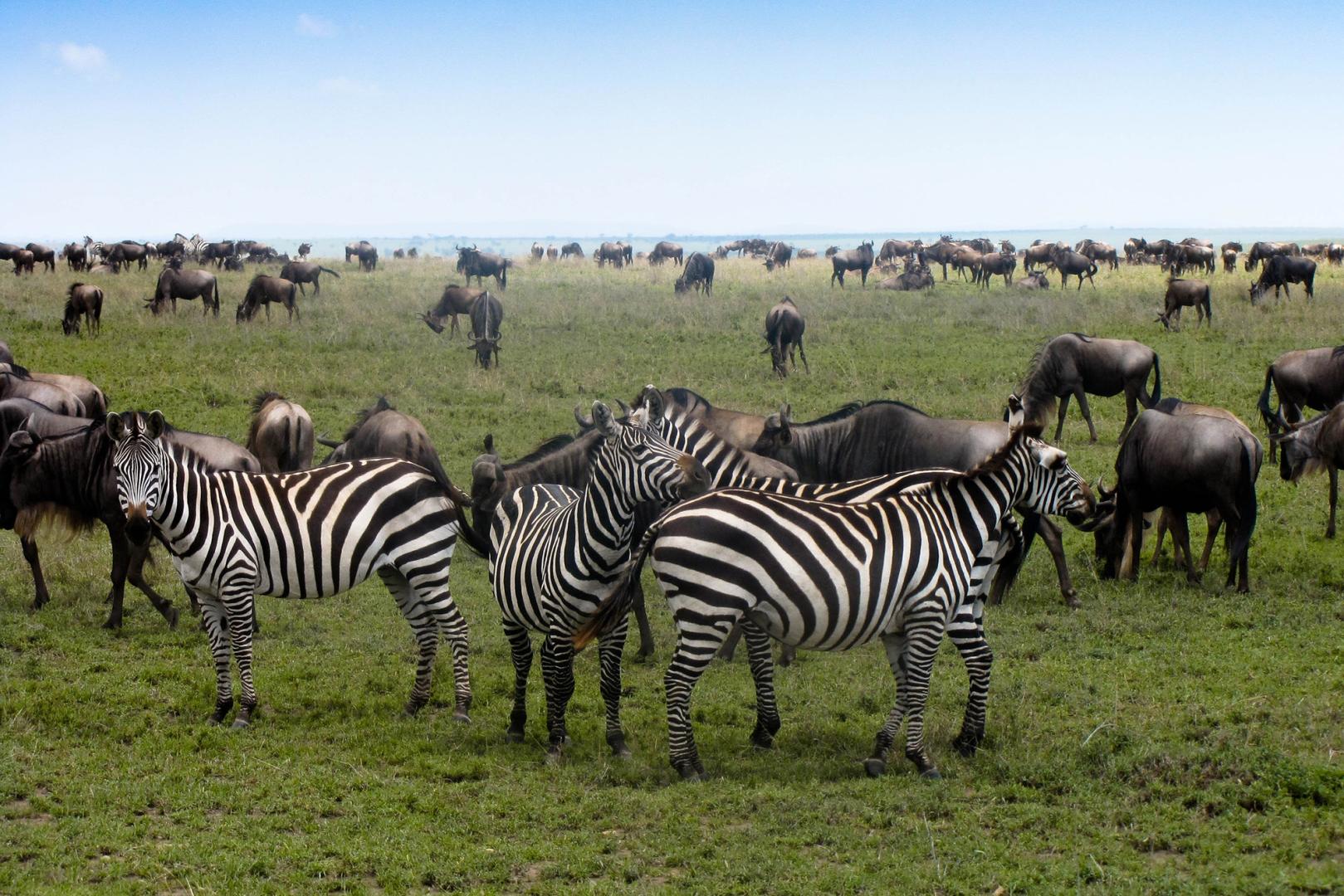 Wir suchen nach den Herden aus Millionen Huftiere, die mit dem Wechsel der Vegetation im Jahresrhythmus um die riesige Serengeti ziehen. Es ist die größte natürliche Massentierwanderung der Erde, die sich in Kilometer langen Schlangenlinien grasend fortbewegen. Es ziehen bis zu 300 000 Thomson Gazellen, 200 000 Zebras, 1,4 Mio. Gnus und viele Tausende Topis, gefolgt von Raubkatzen über die weiten Savannen. Die große Wanderung kann grundsätzlich das ganze Jahr beobachtet werden.