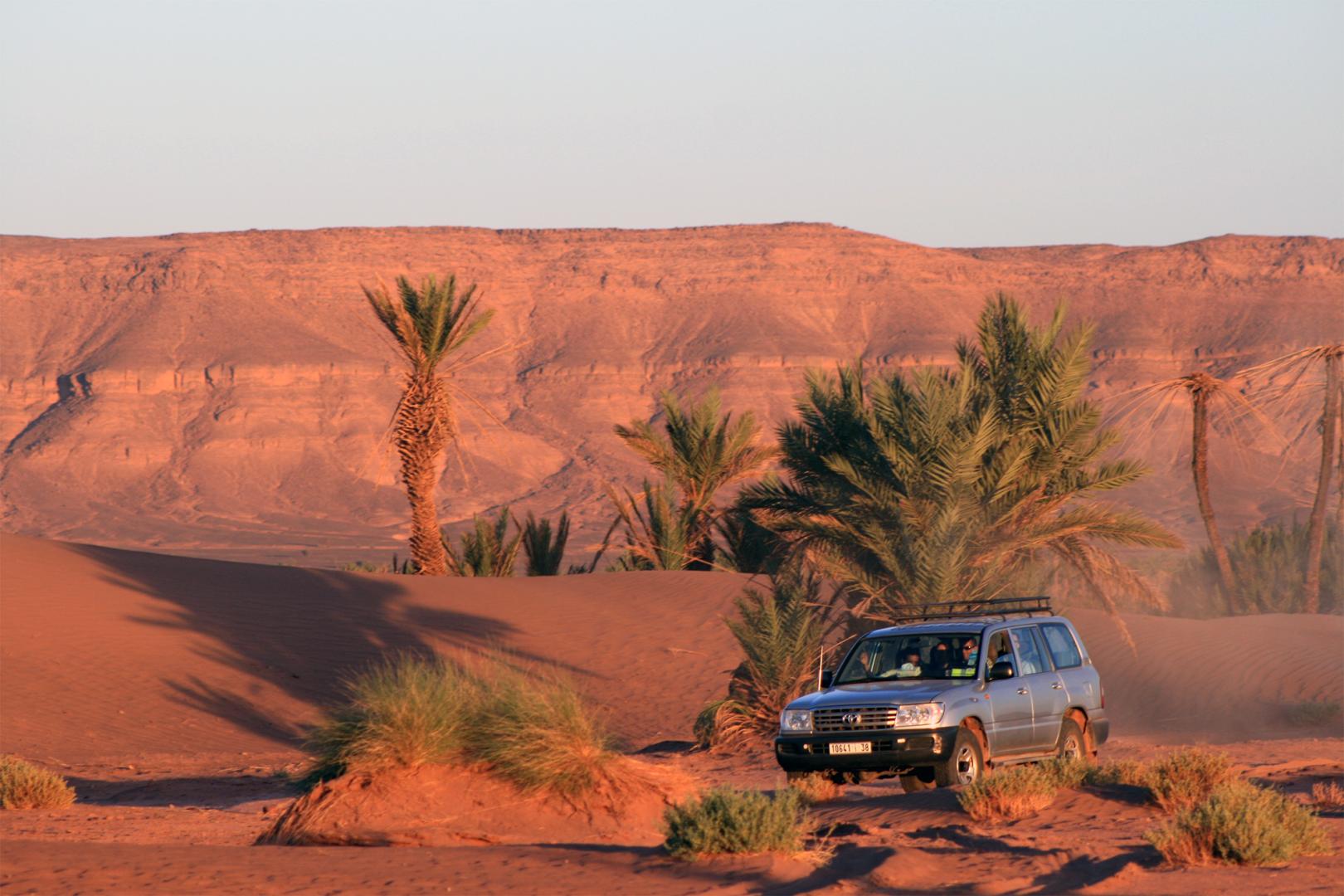 Am Morgen verlassen Sie das Hohe Atlas Gebirge in Richtung Ouarzazate. Auf einem ca. 1160 m Wüstenplateau befindet sich die Wüstenstadt, die bereits vielen Hollywood-Filmen als Kulisse diente: Die rotbraunen Gebäude und Mauern Ouarzazate vor der schroffen Felsformation des Atlas Gebirges mit seinen schneebedeckten Gipfeln und die Steinwüste der Vorsahara. Sie lassen die Stadt hinter sich und passieren Palmplantagen Draa Wadi. Nach insgesamt 5-6 Std. Fahrzeit erreichen Sie Ihre heutige Unterkunft, das Wüstencamp.